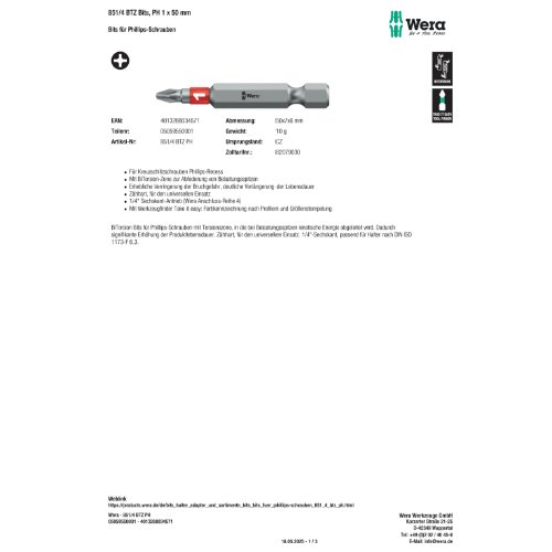 Variante: | Wera 851/4 BTZ Bits, PH 1 x 50 mm |