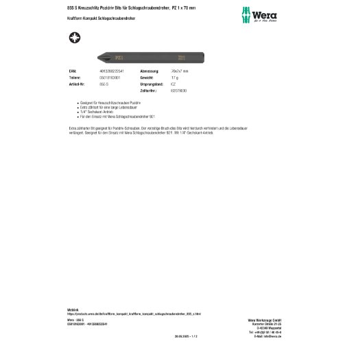 Eigenschaften "Wera 855 S Kreuzschlitz Pozidriv Bits für Schlagschraubendreher, PZ 1 x 70"