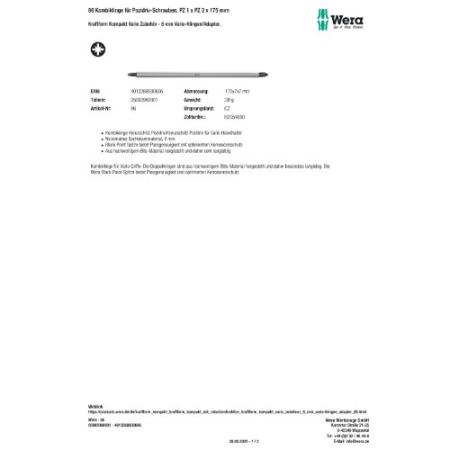 Produktinformationen "Wera 86 Kombiklinge für Pozidriv-Schrauben, PZ 1 x PZ 2 x 175 mm"