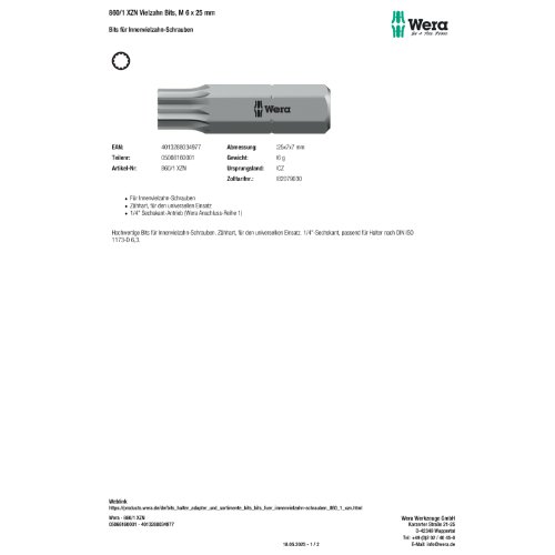 Produktinformationen "Wera 860/1 XZN Vielzahn Bits, M 6 x 25 mm"
