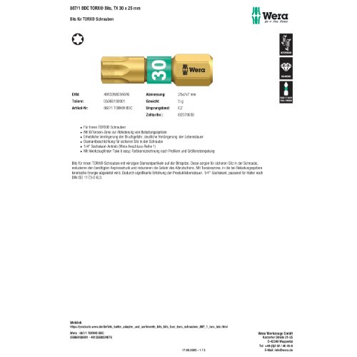 Variante: | Wera 867/1 BDC TORX Bits, TX 30 x 25 mm |
