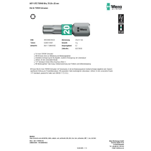 Produktinformationen "Wera 867/1 BTZ TORX Bits, TX 20 x 25 mm"