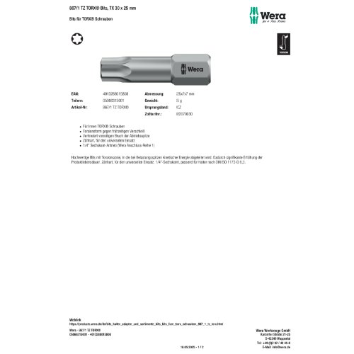 Produktinformationen "Wera 867/1 TZ TORX Bits, TX 30 x 25 mm"