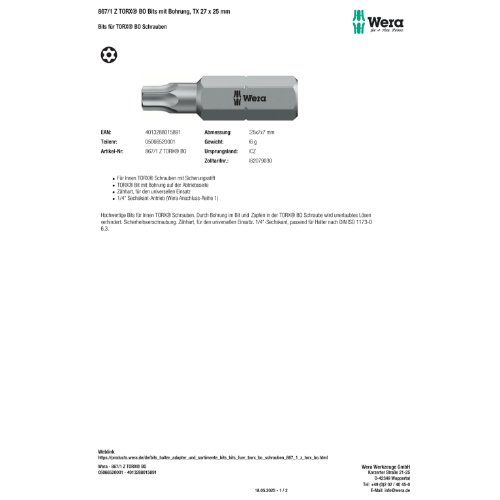 Variante: | Wera 867/1 Z TORX BO Bits mit Bohrung, TX 27 x 25 mm |