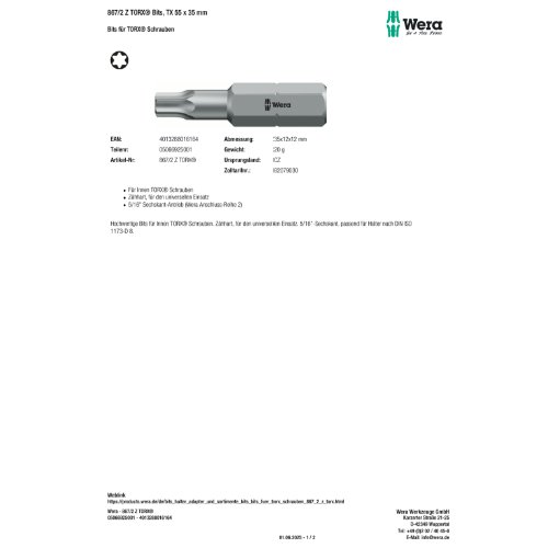 bits, bit, Schraubendrehereinsatz, Bit, Wera, Sechskant, zähhart, TX, TORX-Bit, universal, torx, Torx, 1/4", 442292, 4013288016102, 867/2 Z TORX Bits, TX 25 x 35 mm, 05066900001