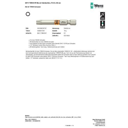 Variante: | Wera 867/4 TORX HF Bits mit Haltefunktion, TX 30 x 50 mm |