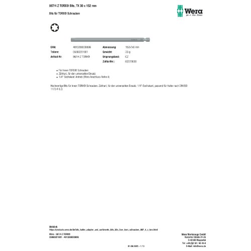 Variante: | Wera 867/4 Z TORX Bits, TX 30 x 152 mm |