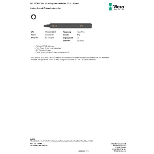 Eigenschaften "Wera 867 S TORX Bits für Schlagschraubendreher, TX 15 x 70 mm"