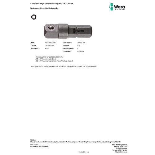 05136000001, 123954, 4013288016997, 870/1 Werkzeugschaft (Verbindungsteil), 1/4" x 25 mm, adapter-nuss, Nutsetter, shaft, tool, Wera, werkzeugschaft, zwischenstück