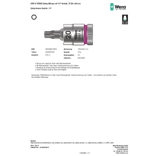 Variante: | Wera 8767 A TORX Zyklop Bitnuss mit 1/4"-Antrieb, TX 20 x 28 mm |