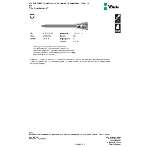 Hersteller: Wera Werkzeuge GmbH, Korzerter Straße 21-25, D- 42349 Wuppertal