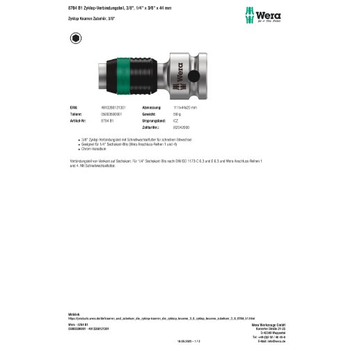 hex, Werkzeug, Schraubwerkzeug, Wera, adaptor, square, adapter, 8784 B1 Zyklop-Verbindungsteil, 3/8", 1/4" x 3/8" x 44, 365388, Bit, 4013288121301, 05003590001, Sechskant, Verbindung, Adapter, Schnellwechselfutter