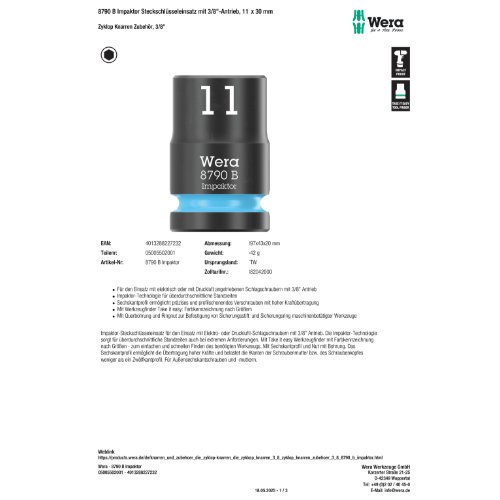 Variante: | Wera 8790 B Impaktor Steckschlüsseleinsatz mit 3/8"-Antrieb, 11 x 30 m |