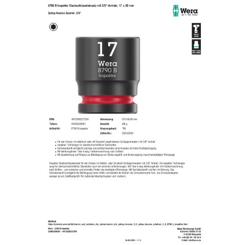 Produktinformationen "Wera 8790 B Impaktor Steckschlüsseleinsatz mit 3/8"-Antrieb, 17 x 30 m"