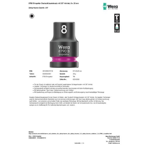 Produktinformationen "Wera 8790 B Impaktor Steckschlüsseleinsatz mit 3/8"-Antrieb, 8 x 30 mm"