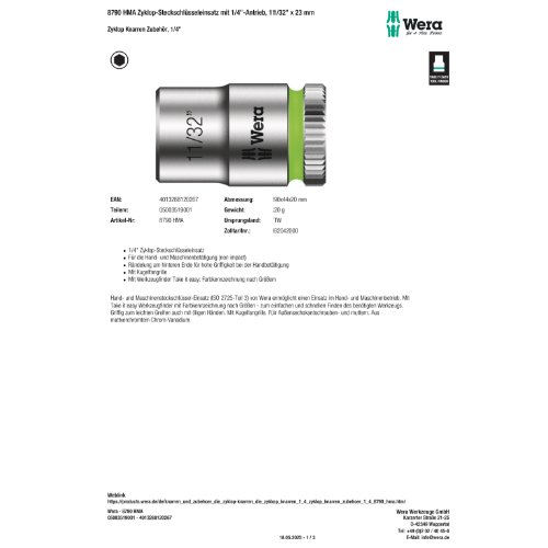 Variante: | Wera 8790 HMA Zyklop-Steckschlüsseleinsatz mit 1/4"-Antrieb, 11/32" |