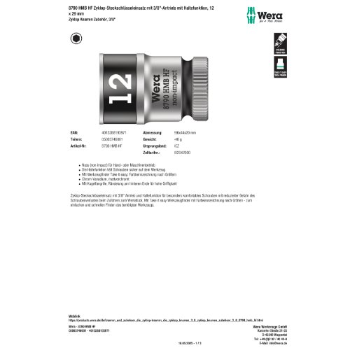 Eigenschaften "Wera 8790 HMB HF Zyklop-Steckschlüsseleinsatz mit 3/8 -Antrieb mit Haltefunktion, 12 x 29 mm"