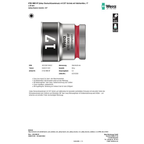 Eigenschaften "Wera 8790 HMB HF Zyklop-Steckschlüsseleinsatz mit 3/8 -Antrieb mit Haltefunktion, 17 x 29 mm"