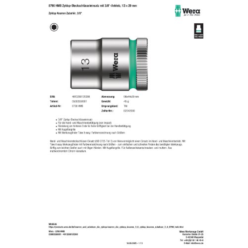 manual, Werkzeug, Schraubwerkzeug, Steckschlüssel-Einsätze, Handwerkzeug, set, Schlüsseleinsatz, Wera, color, colour, Steckschlüsseleinsätze, Steckschlüsseleinsatz-(handbetätigt), Steckschlüsseleinsatz, Steckschlüssel-Einsatz, Schraubenschlüssel, power, socket, 329615, 4013288120380, 05003558001, 8790 HMB Zyklop-Steckschlüsseleinsatz mit 3/8"-Antrieb, 13 x 29 m