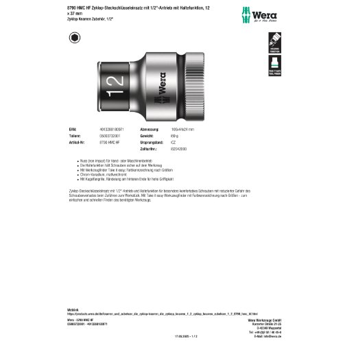 Produktinformationen "Wera 8790 HMC HF Zyklop-Steckschlüsseleinsatz mit 1/2"-Antrieb mit Haltefunktion, 12 x 37 mm"