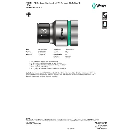 Produktinformationen "Wera 8790 HMC HF Zyklop-Steckschlüsseleinsatz mit 1/2"-Antrieb mit Haltefunktion, 13 x 37 mm"