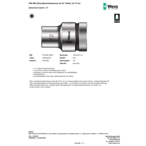 Produktinformationen "Wera 8790 HMC Zyklop-Steckschlüsseleinsatz mit 1/2"-Antrieb, 12 x 37 m"