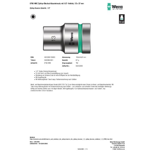 Produktinformationen "Wera 8790 HMC Zyklop-Steckschlüsseleinsatz mit 1/2"-Antrieb, 13 x 37 m"