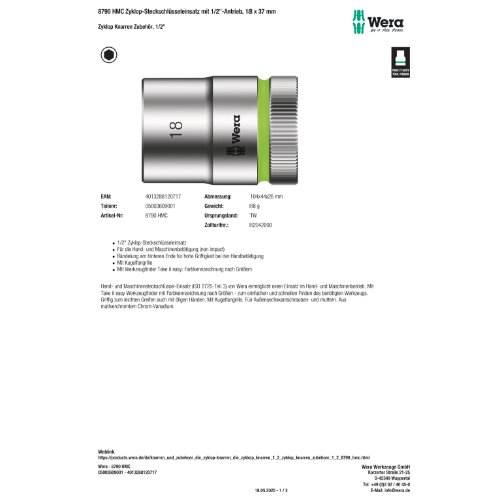 Produktinformationen "Wera 8790 HMC Zyklop-Steckschlüsseleinsatz mit 1/2"-Antrieb, 18 x 37 m"