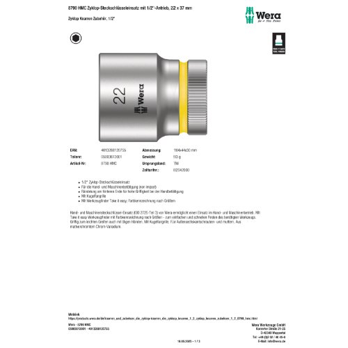 Produktinformationen "Wera 8790 HMC Zyklop-Steckschlüsseleinsatz mit 1/2"-Antrieb, 22 x 37 m"