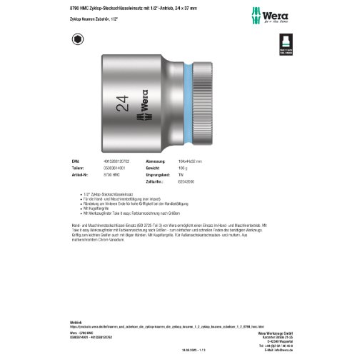 Produktinformationen "Wera 8790 HMC Zyklop-Steckschlüsseleinsatz mit 1/2"-Antrieb, 24 x 37 m"