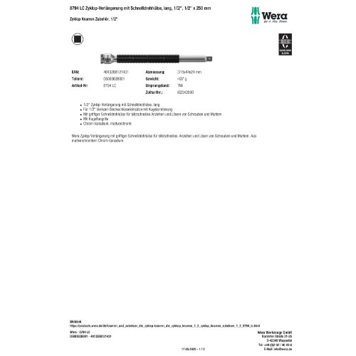 Werkzeug, Zubehör-für-Steckschlüssel, Schraubwerkzeug, Handwerkzeug, Verlängerung, Wera, Schraubwerkzeugzubehör, extension, Schraubenschlüsselzubehör, Steckschlüsselverlängerung, zyklop, Steckschlüsselzubehör, Schraubenschlüssel, free-turning, 8794 LC Zyklop-Verlängerung mit Schnelldrehhülse, lang, 1/2", 1/2, 324714, 4013288121431, 05003638001