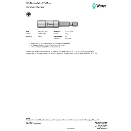 05052575001, 328731, 4013288017239, 890/4/1 Universalhalter, 1/4" x 57 mm, adapter, Adapter, adaptor, bit, Bit, Bithalter, Bithandhalter, bosch, driver, fein, Handwerkzeug, holder, holz-her, lecreux, metabo, Schraubwerkzeug, universal, Wera, Werkzeug