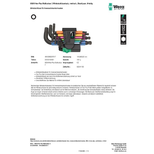 Eigenschaften "Wera 950/9 Hex-Plus Multicolour 2 Winkelschlüsselsatz, metrisch, BlackLaser"