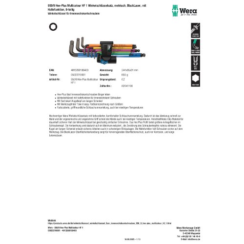 Variante: | Wera 950/9 Hex-Plus Multicolour HF 1 Winkelschlüsselsatz, metrisch, BlackLa |