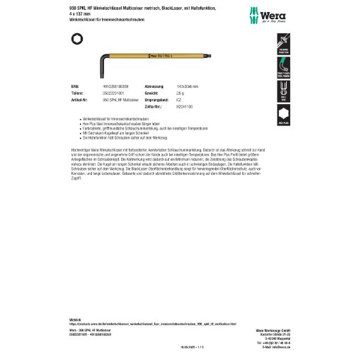 Produktinformationen "Wera 950 SPKL HF Winkelschlüssel Multicolour metrisch, BlackLaser, mit Haltefunktion, 4 x 137 mm"