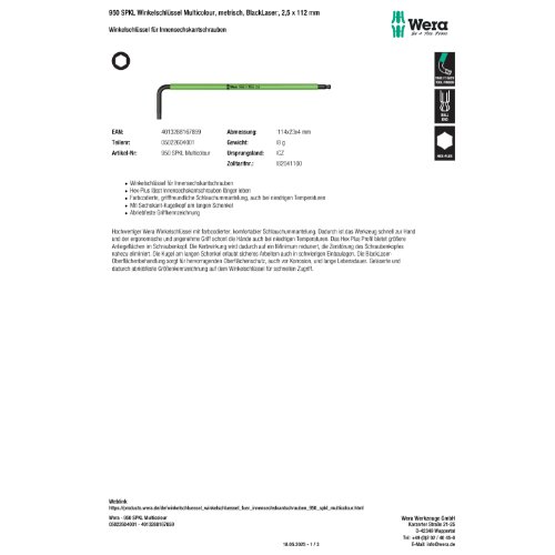 05022600001<br /><br /><b>Angaben gemäß Produktsicherheitsverordnung ((EU) 2023/998):</b><br />Hersteller: Wera Werkzeuge GmbH, Korzerter Straße 21-25, D- 42349 Wuppertal<br />Tel.: +49 (0)202/4045 - 0