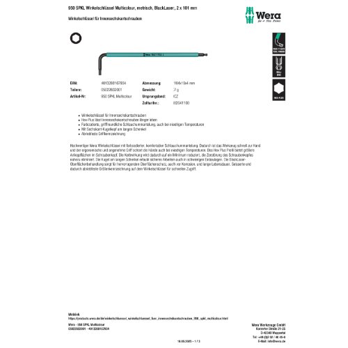 05022602001Angaben gemäß Produktsicherheitsverordnung ((EU) 2023/998): Hersteller: Wera Werkzeuge GmbH, Korzerter Straße 21-25, D- 42349 Wuppertal Tel.: +49 (0)202/4045 - 0