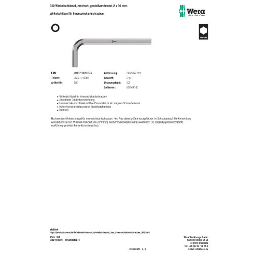 Variante: | Wera 950 Winkelschlüssel, metrisch, gestellverchromt, 2 x 50 mm |