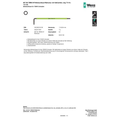 Hersteller: Wera Werkzeuge GmbH, Korzerter Straße 21-25, D- 42349 Wuppertal