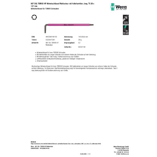 Produktinformationen "Wera 967 SXL TORX® HF Winkelschlüssel Multicolour mit Haltefunktion, lang, TX 20 x 137 mm"