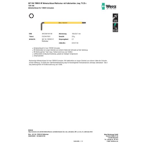 Produktinformationen "Wera 967 SXL TORX® HF Winkelschlüssel Multicolour mit Haltefunktion, lang, TX 25 x 154 mm"