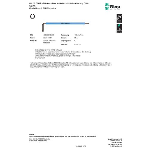 Produktinformationen "Wera 967 SXL TORX® HF Winkelschlüssel Multicolour mit Haltefunktion, lang, TX 27 x 172 mm"