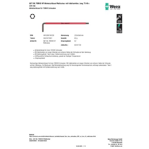 Produktinformationen "Wera 967 SXL TORX® HF Winkelschlüssel Multicolour mit Haltefunktion, lang, TX 40 x 224 mm"
