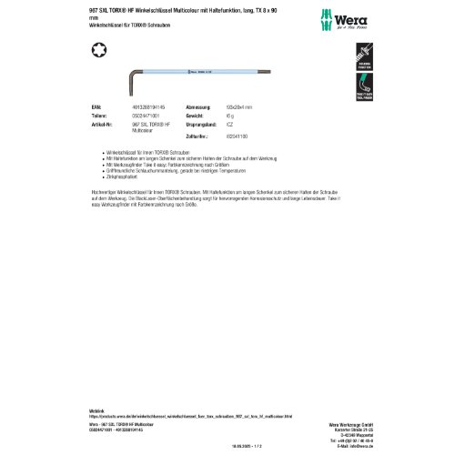 Hersteller: Wera Werkzeuge GmbH, Korzerter Straße 21-25, D- 42349 Wuppertal