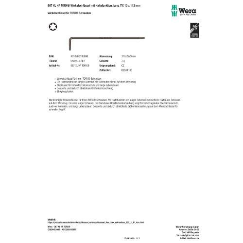 Variante: | Wera 967 XL HF TORX Winkelschlüssel mit Haltefunktion, lang, TX 10 x 112 mm |