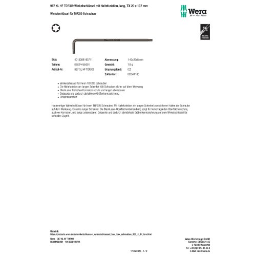 Produktinformationen "Wera 967 XL HF TORX Winkelschlüssel mit Haltefunktion, lang, TX 20 x 137 mm"
