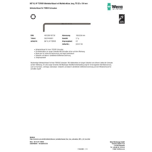 Produktinformationen "Wera 967 XL HF TORX Winkelschlüssel mit Haltefunktion, lang, TX 25 x 154 mm"