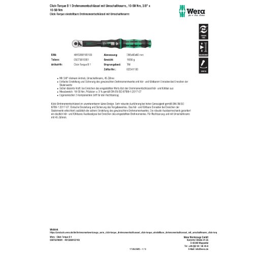 Produktinformationen "Wera Click-Torque B 1 Drehmomentschlüssel mit Umschaltknarre, 10-50 Nm, 3/8"