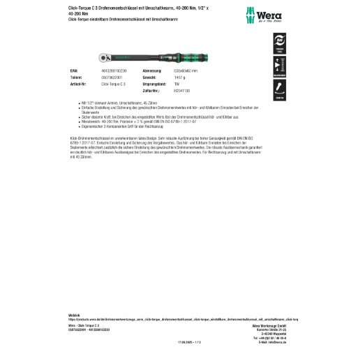 Eigenschaften "Wera Click-Torque C 3 Drehmomentschlüssel mit Umschaltknarre, 40-200 Nm, 1/"