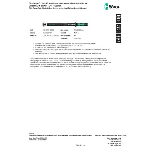 Produktinformationen "Wera Click-Torque C 3 Push R/L einstellbarer Drehmomentschlüssel für Rechts"